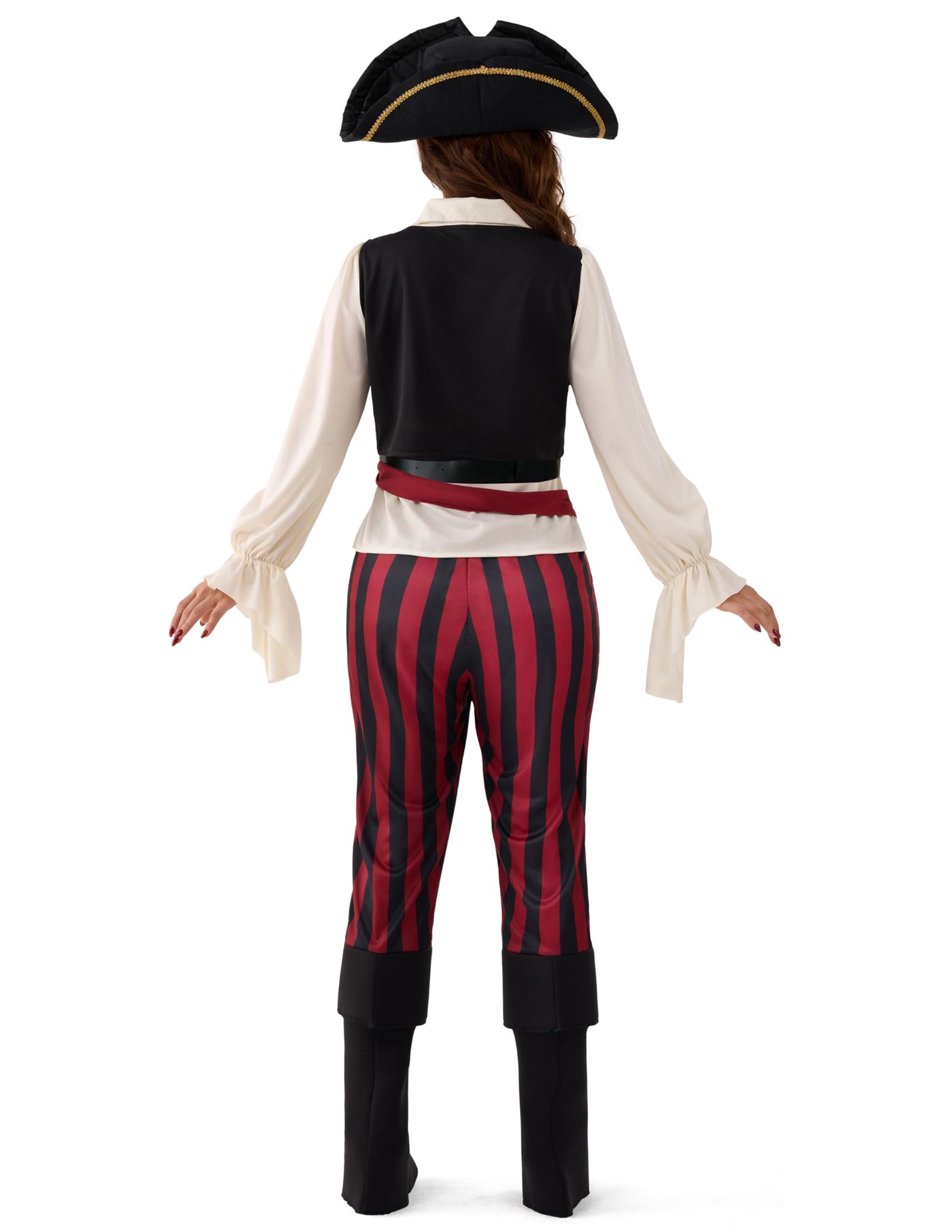 • Stylish & Edgy Design: Women's Renaissance Costume with a pull-over shirt, lace-up neckline, elastic waistband to show the perfect body shape, and ruffled cuffs create a more retro and noble feeling. Black and red striped pants come with attached boot covers, an elastic band is used at the waist to increase the adjustment. Simple yet classic pirate outfit for women, giving you the perfect blend of elegance and adventure for any pirate-themed events.