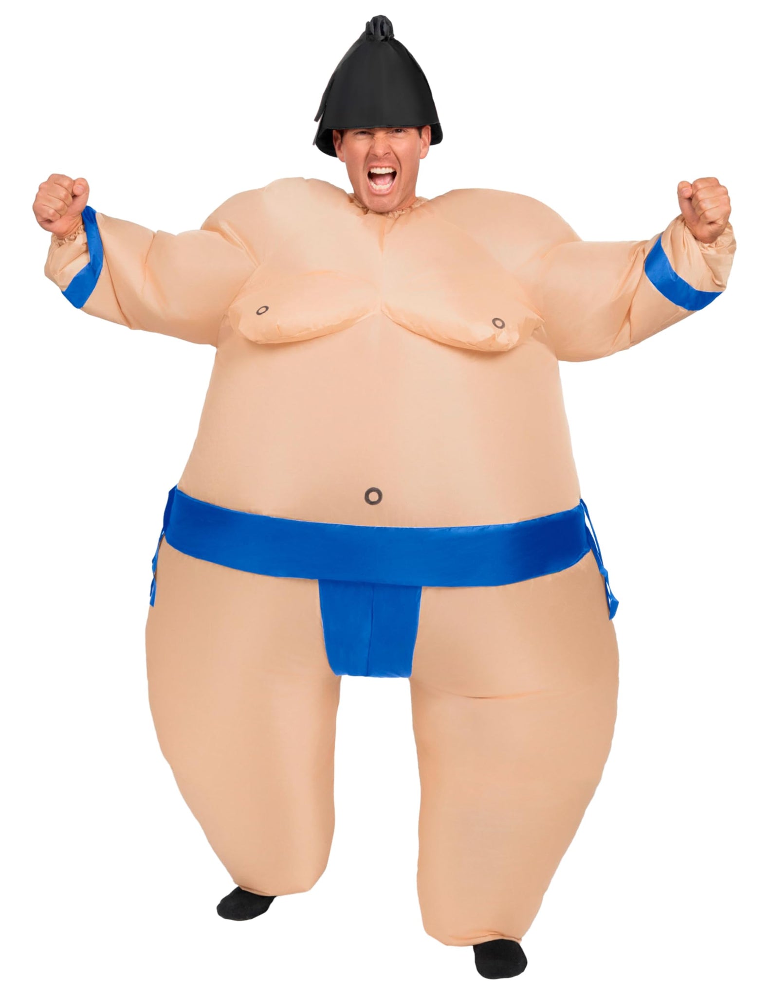 - Complete Set: This inflatable sumo wrestler costume set includes 1 inflatable suit, 1 hat, 1 inflating tool, 1 instruction sheet, and 1 power box (4AA batteries required, but not included). The suit is designed to look like a sumo wrestler, with a bold blue loincloth mawashi belt.