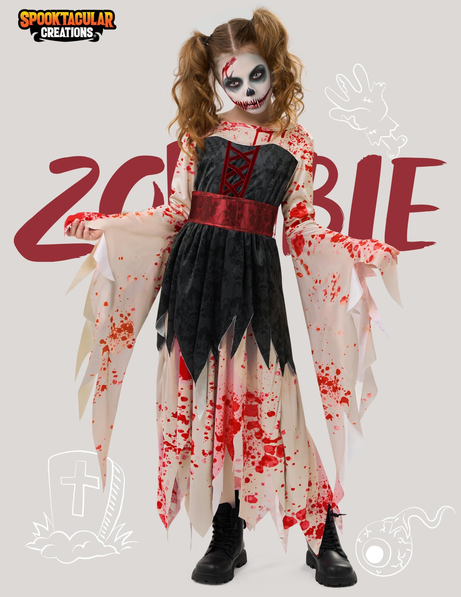 - Flattering Fit Options:Our Halloween Zombie Costume is available in four sizes: Small ( 5 - 6 yrs), Medium ( 7 - 8 yrs), Large ( 9 - 10 yrs) , X-Large ( 11 - 12 yrs) to suit most girls. Model is 4'6", 57 lbs, wearing size M. Please refer to the size chart for the perfect fit.