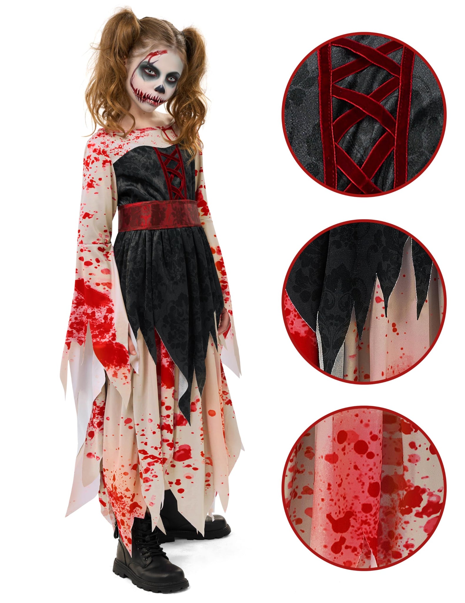 - Sooky & Edgy Design:Our Halloween Zombie Costume features a moderate-fit silhouette with a full-length dress. This spooky zombie costume's details include jagged-cut sleeves and hem, a lace-up bodice, and a two-layered skirt splattered with eerie blood stains—blending royal elegance with zombie flair.