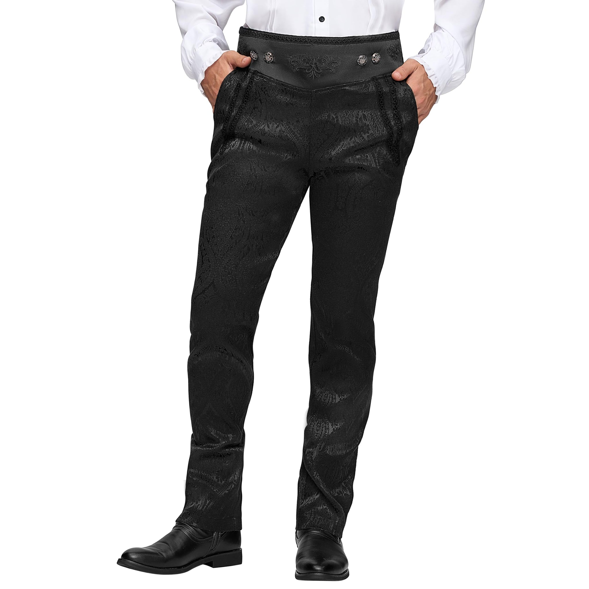 - HIGH-QUALITY MATERIALS: Crafted from high-quality 100% polyester and knitted Jacquard fabric, our high waisted steampunk pants offers a slim flexibility for a comfortable and durable wear. The embroidery pattern on the waist adds an elegant touch to your ensemble.