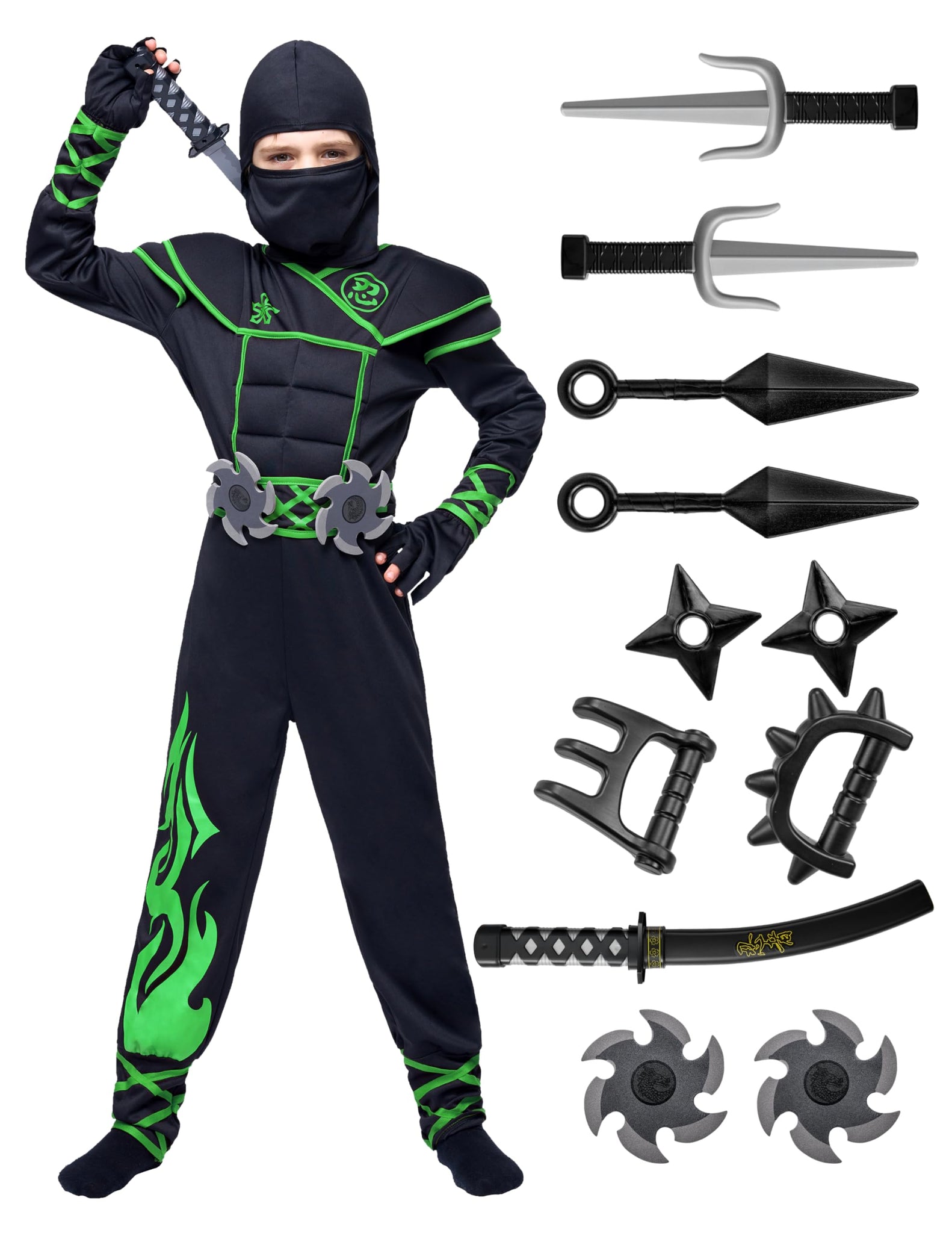 - Our Ninja Halloween Costume includes 1 Hooded Shirt, 1 Pair of Pants, 1 Mask, 1 Armour, 1 Belt, 1 Pair of gloves, and other foam accessories.