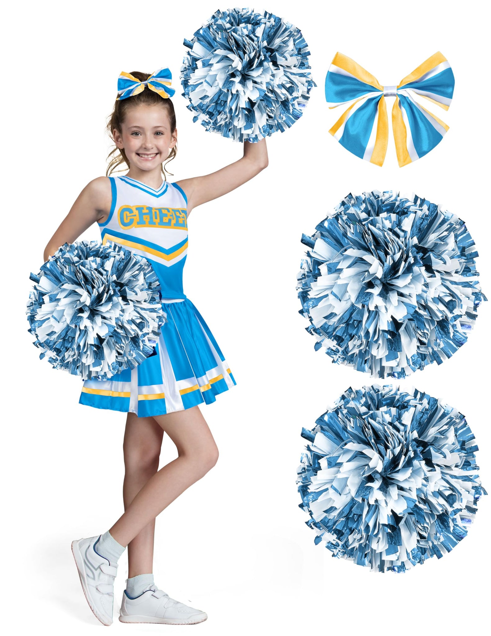 - Super Value Pack: This cheerleader costume set includes 1 top, 1 skirt, 1 hair clip, and 2 pompoms. The top and skirt come in matching colors with yellow accents for an authentic cheerleading look. The pom poms add a fun touch, and the hair clip is the perfect finishing touch to the costume.