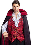 - Cool Victorian Goth Vampire Costume for Men Includes Shirt with Attached Vintage Vampire Vest and Jabot, Cape with Stand-Up Maroon Collar and Vampire Cane.