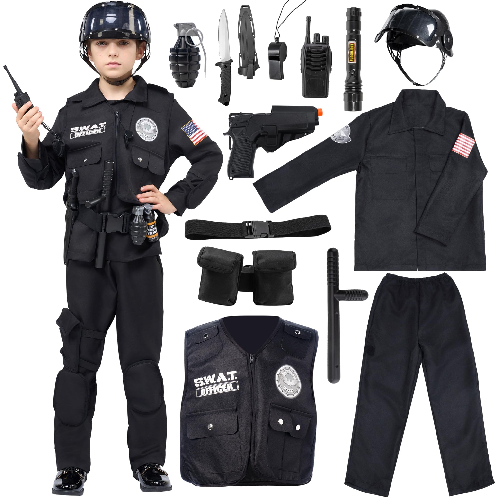 - Our SWAT Officer Costume for Boys comes with the Helmet, Shirt,Vest, Belt, Pair of Pants, Grenade,Walkie-Talkie, Baton, Whistle, Flashlight and 1 Other Accessories. Your child will easily slip into his heroes' role. There are two color versions of grenade and knife, one is black and the other is desert color, shipped randomly. This costume has everything needed for your kid to play the leader of an elite police team.