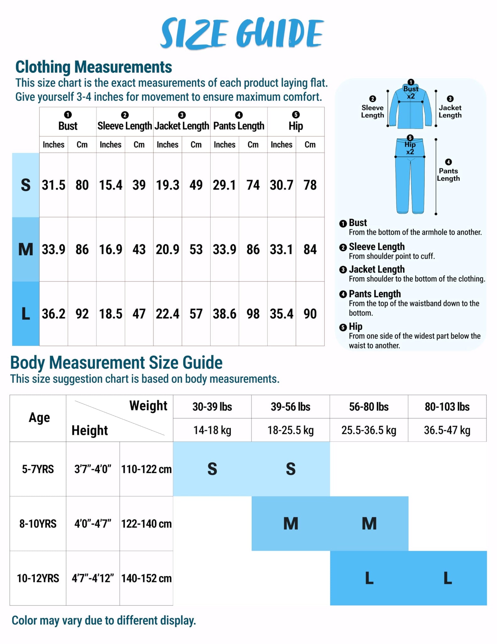 - Size: 3T (3-4 yr) Small ( 5 – 7 yrs) Medium (8-10 yrs) Large (10-12 yr)